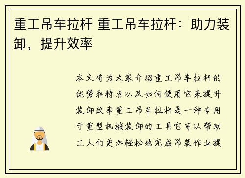 莱芜黄庄腾飞吊车是一家专业从事吊车制造的企业,凭借其卓越的品质和技术,成为了行业的领导者。本文将介绍莱芜黄庄腾飞吊车的背景信息,并从多个方面对其进行详细阐述。 1. 创新设计:引领行业的发展 莱芜黄庄腾飞吊车以其创新的设计理念,不断引领行业的发展。公司拥有一支专业的设计团队,致力于研发出更加高效、安全的吊车产品。通过不断的技术创新和设计优化,莱芜黄庄腾飞吊车在市场上赢得了良好的声誉。 2. 高品质...
